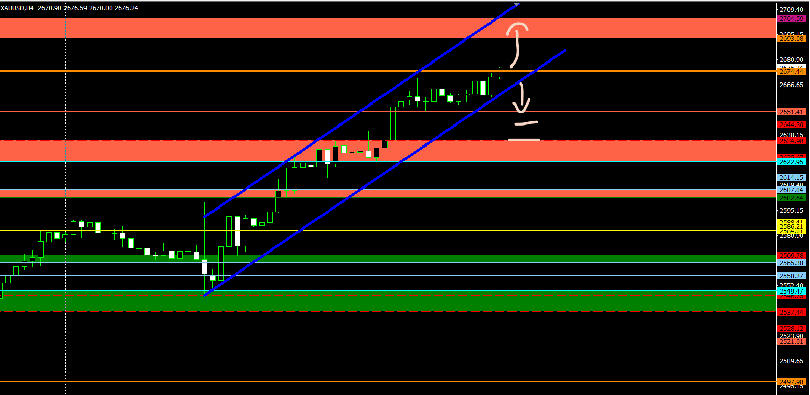 كما نرى فى التحليل الاسبوعى الذهب يسير فى قناه صاعده بشموع ال 4 ساعات و يحترم اركان القناه جيدا و مستهدفاته الى 2694 $ و حتى 2704 $ كمستويات مقاومه اسبوعيه بشرط استمرا اغلاق شموع 4 ساعات اعلى مستويات 2675 $. اما فى حال اغلاق شموع 4 ساعات تحت مستويات 2675 $ بشكل منتظم سنرى تراجع تصحيحى للدعم 2651 $ و حتى 2644 $ الى 2635 $