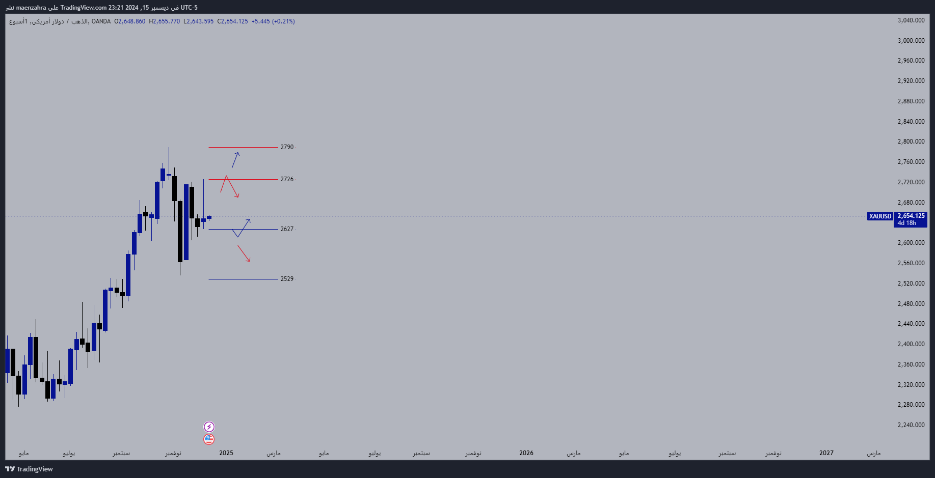 لنقدر نقول الذهب سلبي اسبوعياً نحنا بحاجة كسر وثبات شمعة اسبوعية اسفل 2500