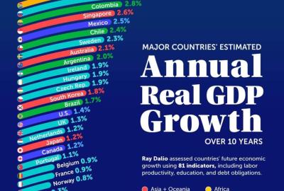 توقعات نمو الناتج المحلي الإجمالي الحقيقي للسنوات العشر القادمة، حسب الدولة منذ عام 2021، ينشر مدير صندوق التحوط راي داليو تقارير عن ديناميكيات القوة العالمية وسط الاتجاهات الجيوسياسية والاقتصادية المتطورة. وعلى وجه الخصوص، يحلل داليو آفاق المستقبل للدول الكبرى، التي تشكلها قوى سوق العمل والاستقرار الاقتصادي والعوامل الاجتماعية. يوضح هذا الرسم البياني توقعات نمو الناتج المحلي الإجمالي الحقيقي السنوي لمدة 10 سنوات، بناءً على تحليل من مؤشر القوى العظمى 2024 لراي داليو.